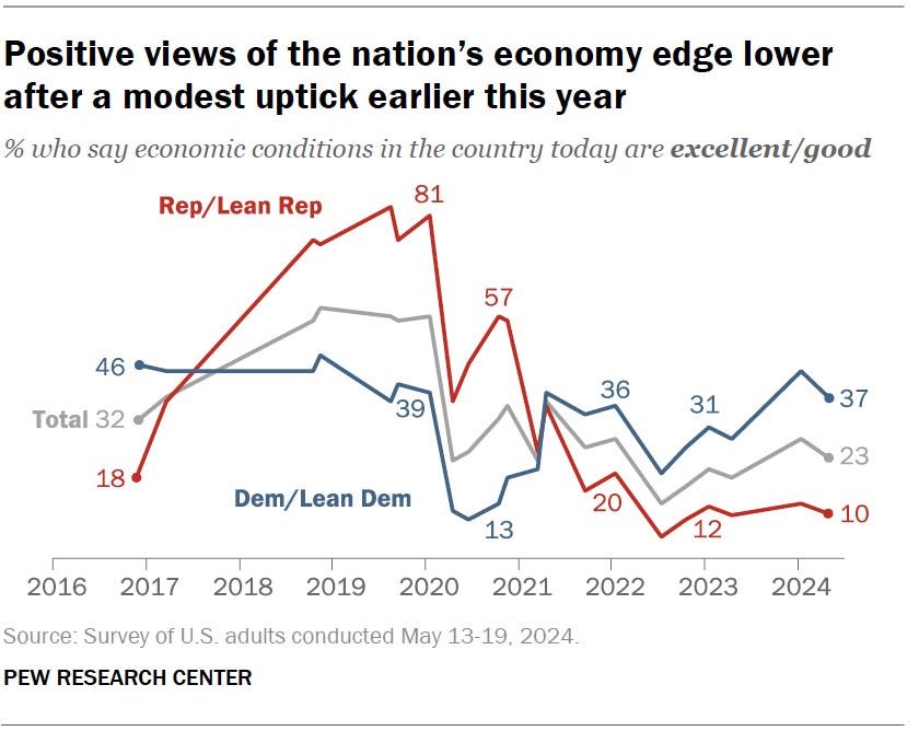 A Pew Research study conducted earlier this year revealed that less than 1 in 4 Americans feel the economy is excellent or good. This sentiment contrasts sharply with the continuing growth of the economy as reflected in the rising GDP. While economic indicators show progress, many Americans do not perceive these benefits, highlighting a disconnect between macroeconomic growth and individual financial well-being.