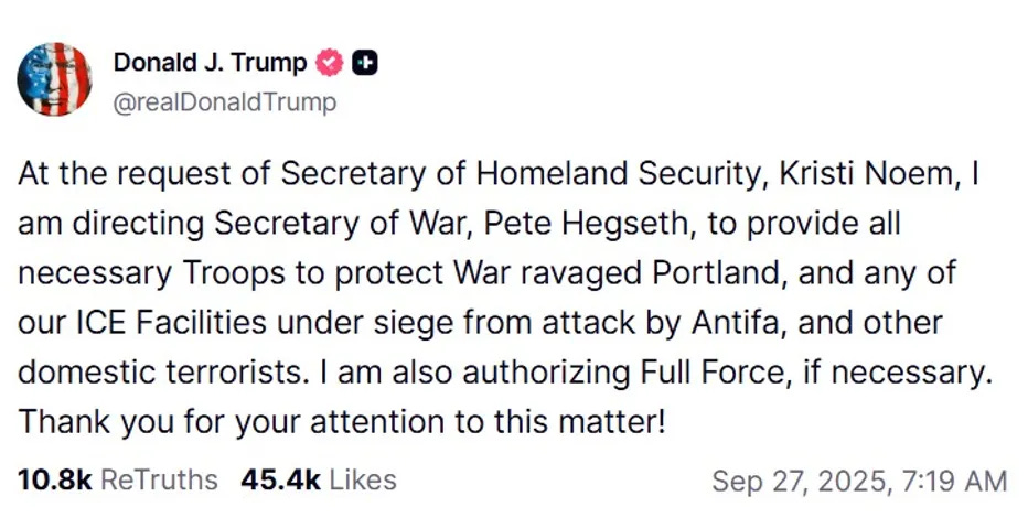On September 27, the President of the United States posted a message on Truth Social announcing that he had authorized the deployment of troops and directed the Secretary of Defense to use “Full Force, if necessary” against “Antifa and other domestic terrorists” allegedly threatening ICE facilities in Portland, Oregon.