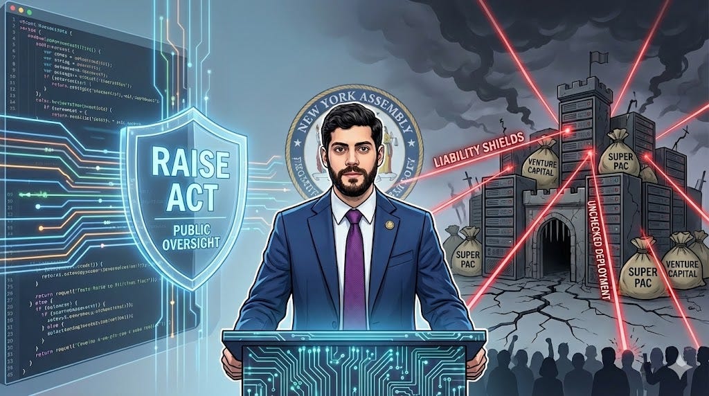 A new super PAC, Leading the Future —armed with a massive war chest and backed by executives who are simultaneously lobbying Washington for liability protections and public financial backstops —has begun running attack ads against Bores. The alignment is instructive. The same actors pushing for rapid AI deployment are also seeking to offload its legal and economic risks onto the public —privatizing gains while socializing potential failures.